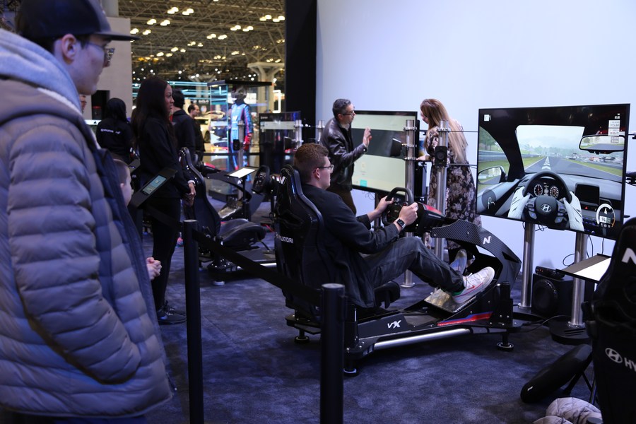 A visitor tries on a driving simulator at the New York International Auto Show 2024 in New York, the United States, on March 29, 2024. (Xinhua/Liu Yanan)