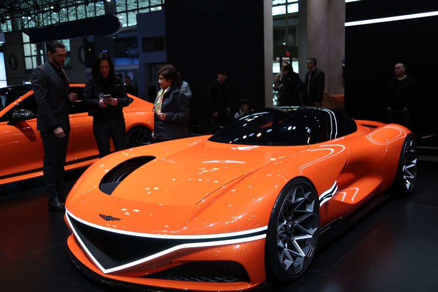 Visitors look at a car at the New York International Auto Show 2024 in New York, the United States, on March 29, 2024.(Xinhua/Liu Yanan)
