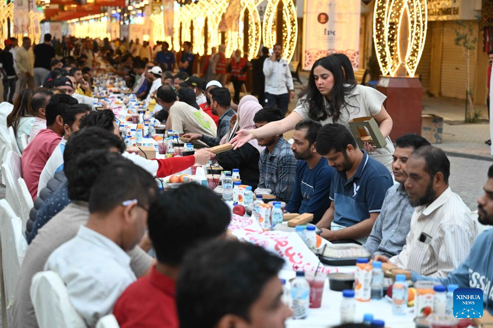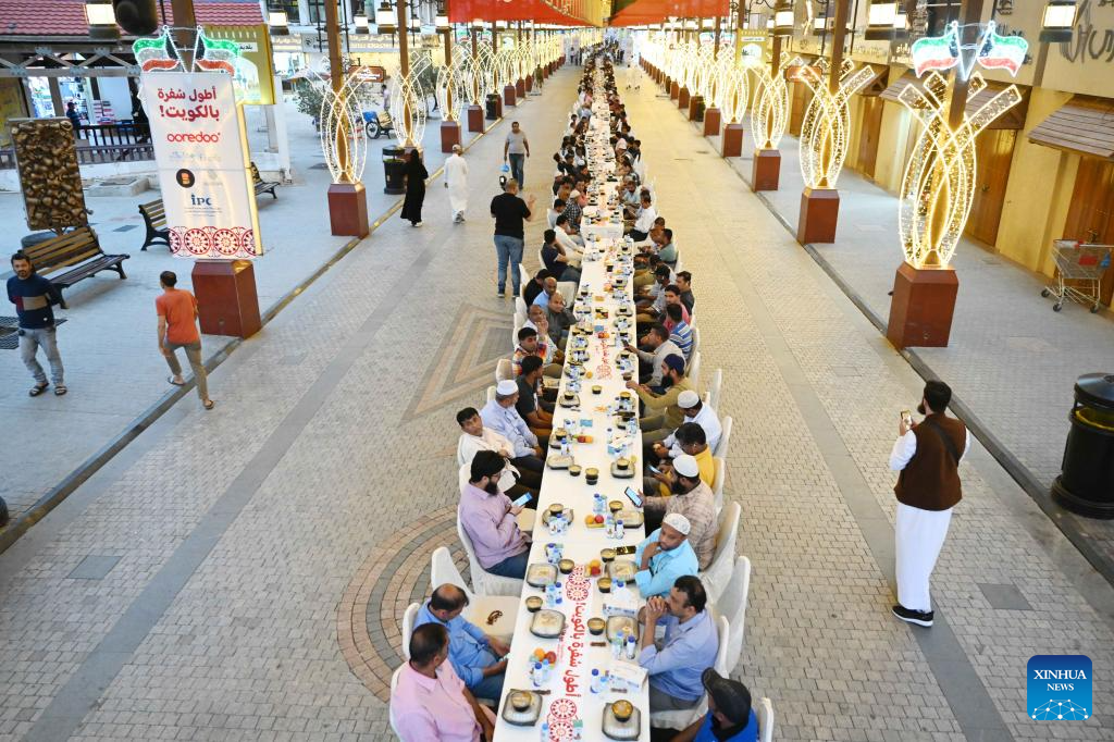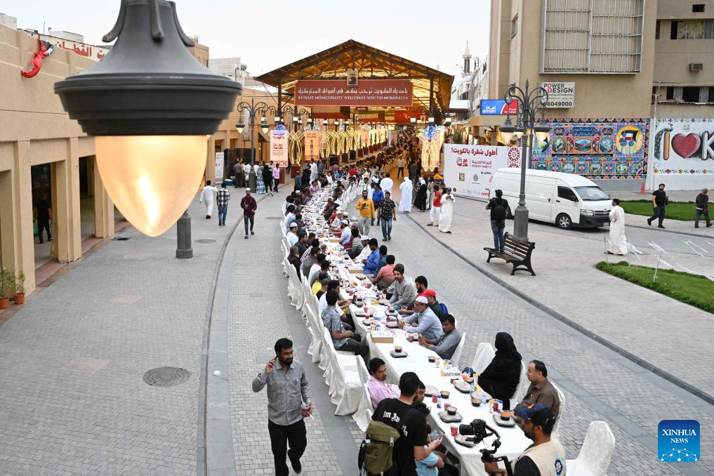 People attend an iftar banquet in Kuwait City, Kuwait, March 30, 2024. An iftar banquet for 1,500 people was held in Al-Mubarakiya marketplace of Kuwait City on Saturday. (Photo by Asad/Xinhua)
