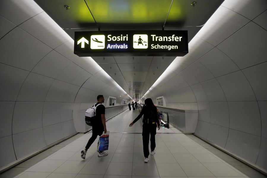 A newly installed sign indicating the direction for Schengen travelers is seen at Henri Coanda International Airport near Bucharest, Romania, March 31, 2024. (Photo by Cristian Cristel/Xinhua)