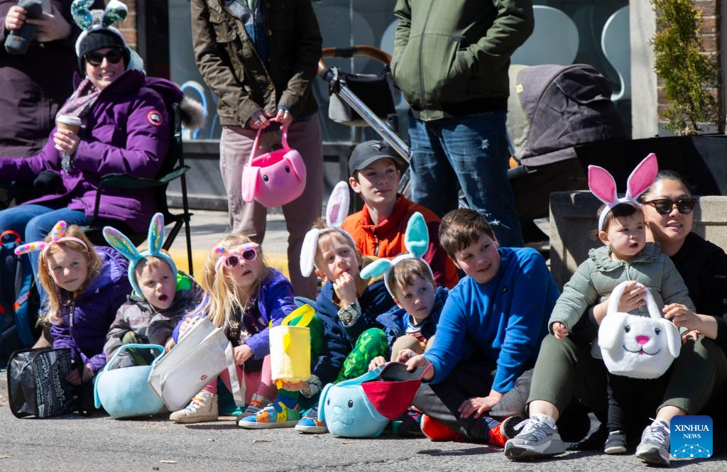 Children wearing bunny ear decorations sit on the curb waiting for a candy distribution during the 2024 Toronto Beaches Lions Easter Parade in Toronto, Canada, on March 31, 2024. (Photo by Zou Zheng/Xinhua)