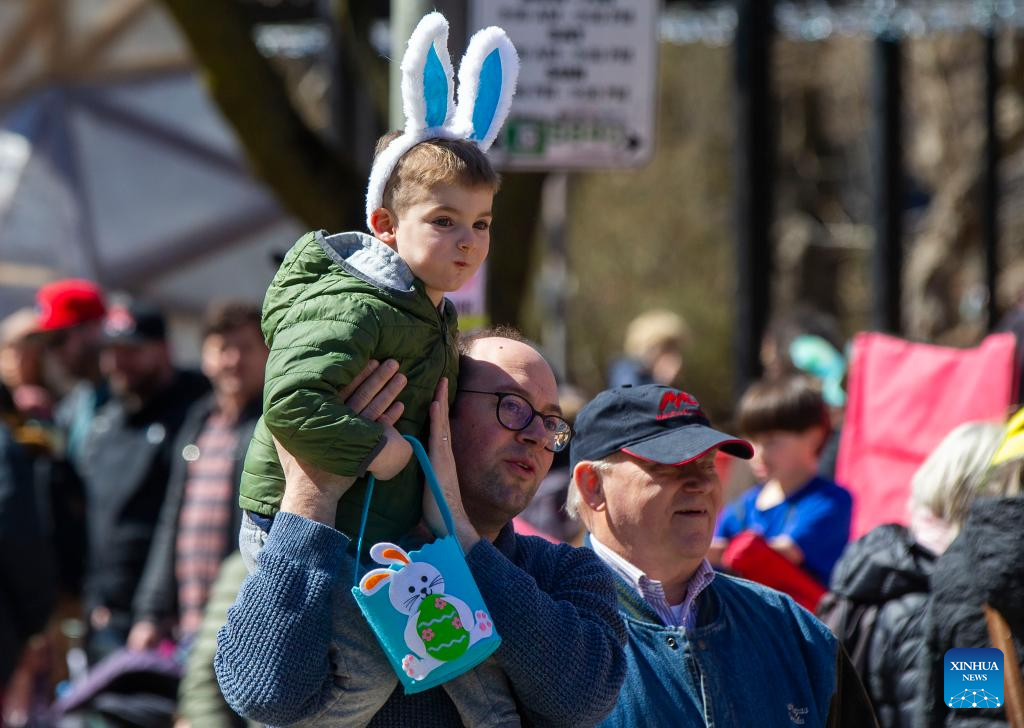 A boy wearing a bunny ear decoration sits on his father's shoulder waiting for a candy distribution during the 2024 Toronto Beaches Lions Easter Parade in Toronto, Canada, on March 31, 2024. (Photo by Zou Zheng/Xinhua)