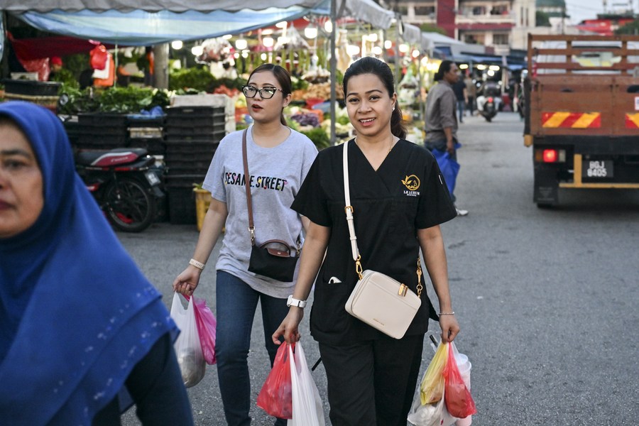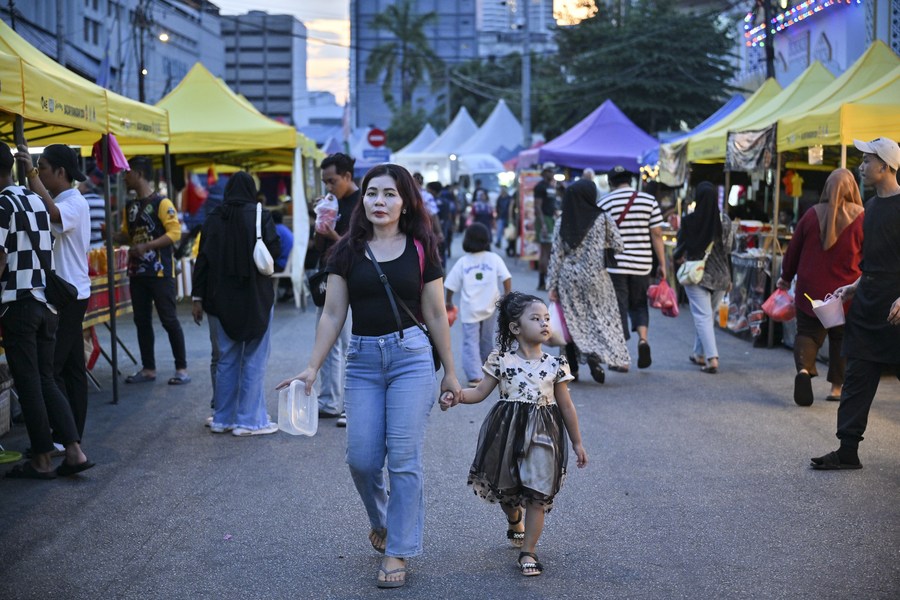 Photo shows people walking at a market during the Islamic holy month of Ramadan in Kuala Lumpur, Malaysia, April 1, 2024. (Xinhua/Cheng Yiheng)