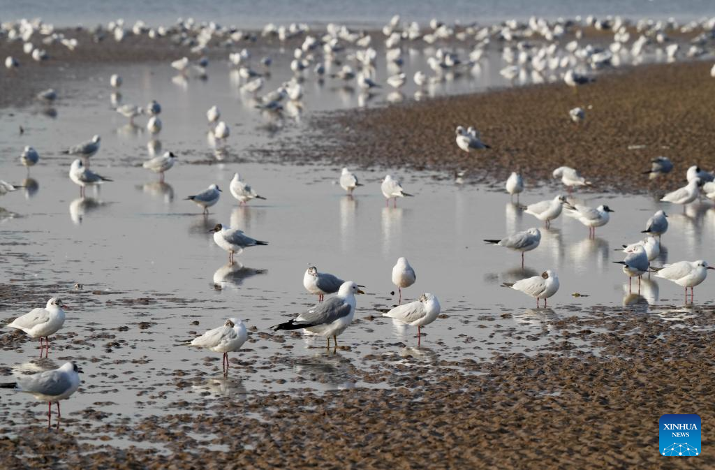 Waterfowls forage at a coastal wetland in Beidaihe District of Qinhuangdao, north China's Hebei Province, March 31, 2024. (Xinhua/Yang Shiyao)