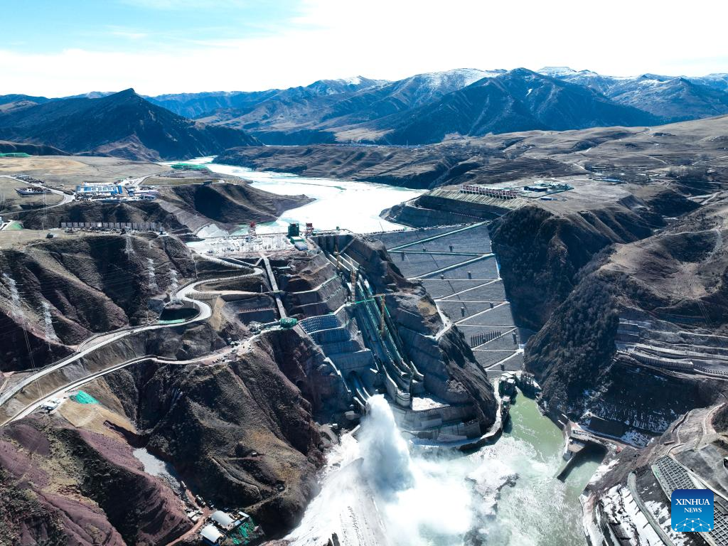 An aerial drone photo taken on April 1, 2024 shows the Maerdang Hydropower Station in Hainan Tibetan Autonomous Prefecture in northwest China's Qinghai Province. The first unit of the Maerdang Hydropower Station, the highest-altitude facility of its kind on the upper reaches of the Yellow River, was connected to the grid in Qinghai Province on Monday. With all units put into use in December, the station is expected to generate an average of 7.3 billion kWh of electricity per year. (Xinhua/Zhang Long)