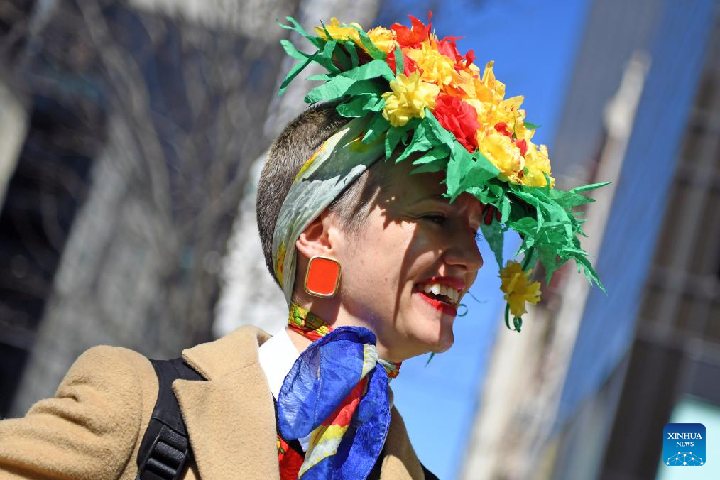 A woman takes part in the Easter Parade and Bonnet Festival in New York, the United States, on March 31, 2024. (Xinhua/Li Rui)