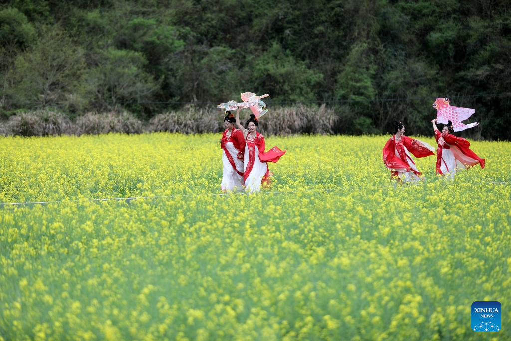 Tourists wearing traditional costumes fly kites in a cole flower field in Xiuning County of Huangshan City, east China's Anhui Province, March 31, 2024. (Photo by Fan Chengzhu/Xinhua)