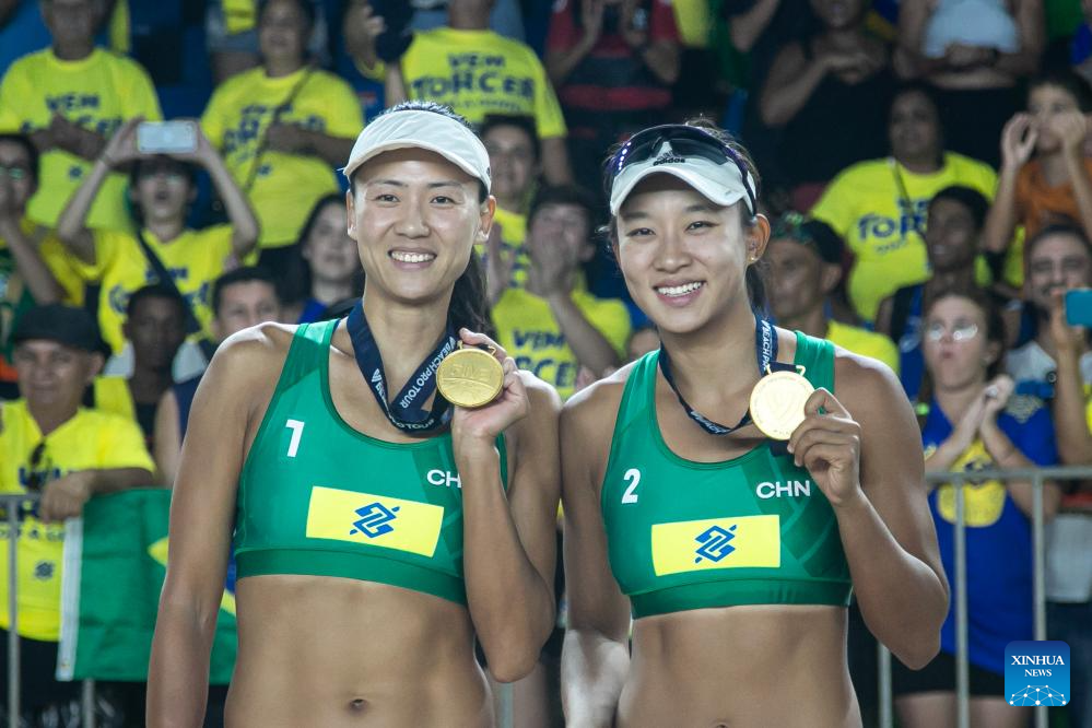 Gold medalists Xue Chen (L)/Xia Xinyi of China pose for a photograph during the awarding ceremony at the World Beach Volleyball Pro Tour Challenge 2024 in Saquarema, Brazil, March 31, 2024. (Photo by Claudia Martini/Xinhua)