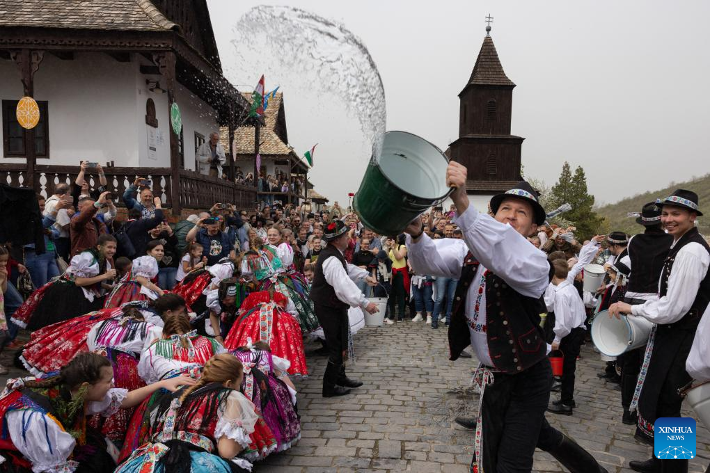 A man splashes water as part of the traditional Easter celebration in Holloko, Hungary, on April 1, 2024. (Photo by Attila Volgyi/Xinhua)