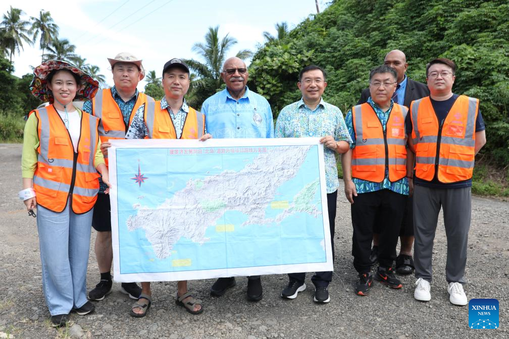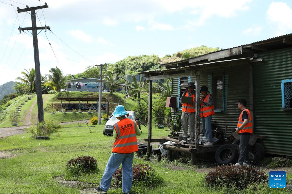 Staff members from China inspect the road upgrade project in Vanua Levu, Fiji, April 2, 2024. China's assistance is instrumental in the development of Fiji and other Pacific island countries, said Fijian Prime Minister Sitiveni Rabuka.(Photo by Sang Qinlong/Xinhua)