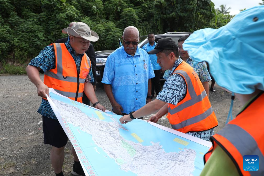 Fijian Prime Minister Sitiveni Rabuka (2nd L) visits the road upgrade project in Vanua Levu, Fiji, April 2, 2024. China's assistance is instrumental in the development of Fiji and other Pacific island countries, said Fijian Prime Minister Sitiveni Rabuka.(Photo by Sang Qinlong/Xinhua)