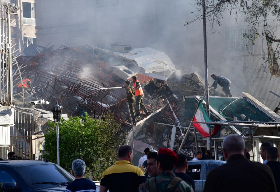 Rescuers work at the site of an Israeli missile attack targeting the building of the Iranian Consulate in Damascus, Syria, April 1, 2024. (Photo by Ammar Safarjalani/Xinhua)