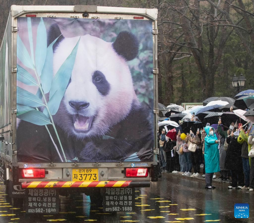 People bid farewell to giant panda Fu Bao amid rain at Everland in Yongin, South Korea, April 3, 2024. Beloved Fu Bao, the first giant panda born in South Korea, left South Korea for China on Wednesday amid a large crowd's tearful farewell. Thousands of panda lovers gathered at Everland, the country's largest theme park in Yongin, about 40 km south of the capital Seoul, to say goodbye to the country's top panda celebrity. (Xinhua/Yao Qilin)