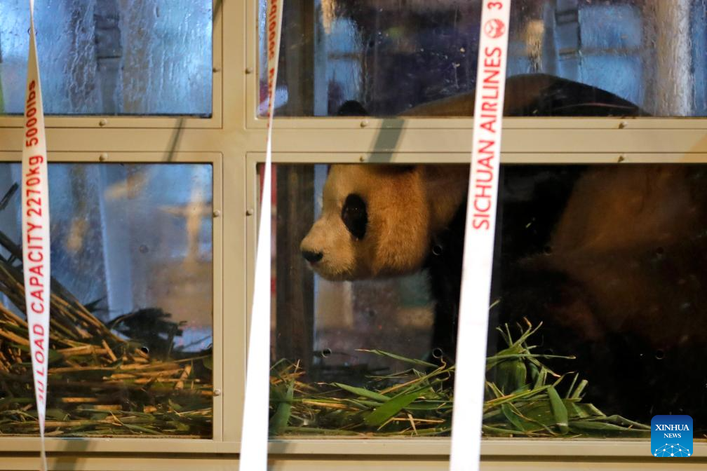 Giant panda Fu Bao arrives at the Chengdu Shuangliu International Airport in Chengdu, southwest China's Sichuan Province, April 3, 2024. A chartered flight carrying the giant panda Fu Bao landed in Chengdu, Sichuan Province, at around 7:22 p.m. on Wednesday. Fu Bao is the first giant panda that was born in the Republic of Korea (ROK) to Le Bao and Ai Bao, the pandas leased by China to the country in 2016. (Xinhua/Shen Bohan)