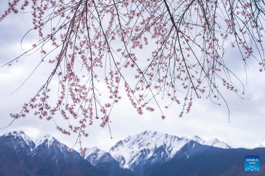 This photo taken on April 2, 2024 shows peach blossoms with Mount Namjagbarwa in the background near Suosong Village in Nyingchi, southwest China's Xizang Autonomous Region. (Xinhua/Sun Fei)