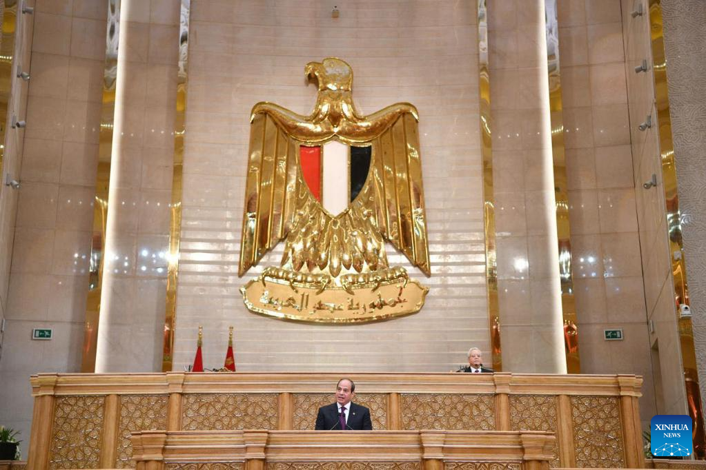 Egyptian President Abdel-Fattah al-Sisi speaks during his swearing-in ceremony at the headquarters of the Egyptian Parliament in the New Administrative Capital, Egypt, April 2, 2024. Abdel-Fattah al-Sisi took the constitutional oath on Tuesday as president of Egypt for a third consecutive term in office, serving until 2030, the state-run Nile TV reported. (Egyptian Presidency/Handout via Xinhua)