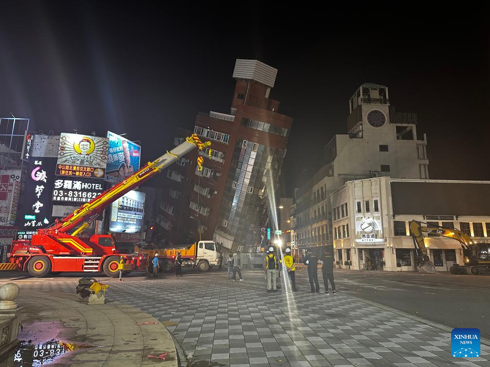 This photo taken on April 3, 2024 shows a tilted building after a 7.3-magnitude earthquake jolted the sea area near Hualien, southeast China's Taiwan. The 7.3-magnitude quake in China's Taiwan on Wednesday morning had left nine people dead and 1,011 people injured as of 10 p.m. Wednesday, according to the local emergency operation center. (Xinhua)