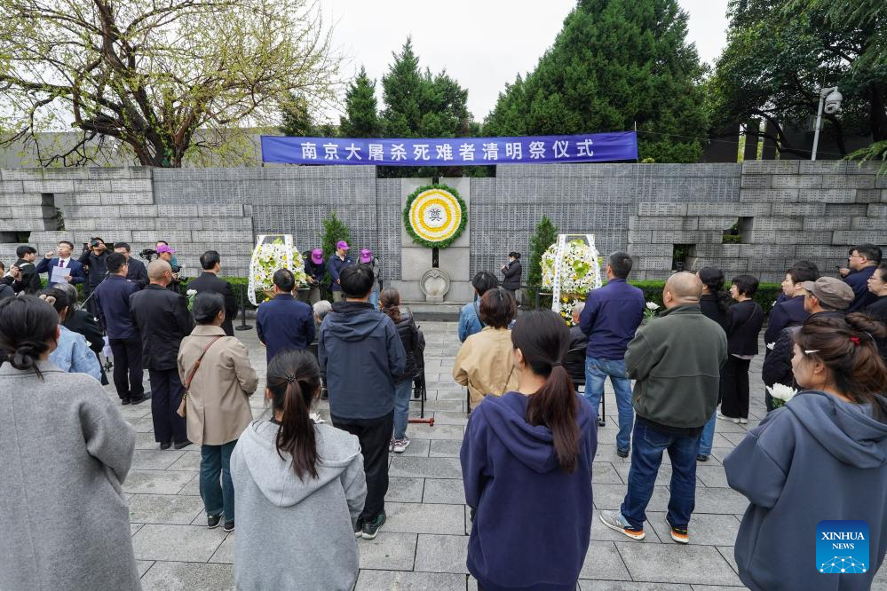 This photo taken on April 3, 2024 shows a memorial ceremony at the Memorial Hall of the Victims in Nanjing Massacre by Japanese Invaders, in Nanjing, east China's Jiangsu Province.