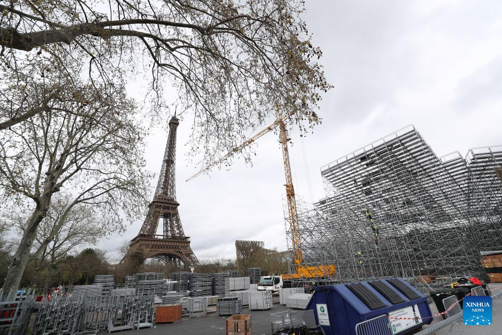 Olympic and Paralympic construction sites are seen on the Champ-de-Mars near the Eiffel Tower in Paris, France, April 2, 2024. (Xinhua/Gao Jing)
