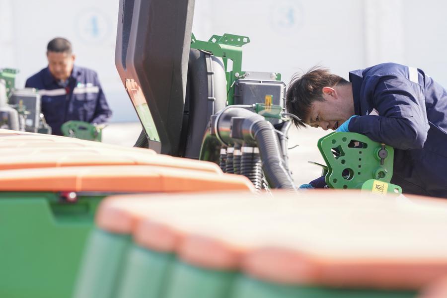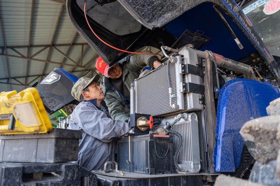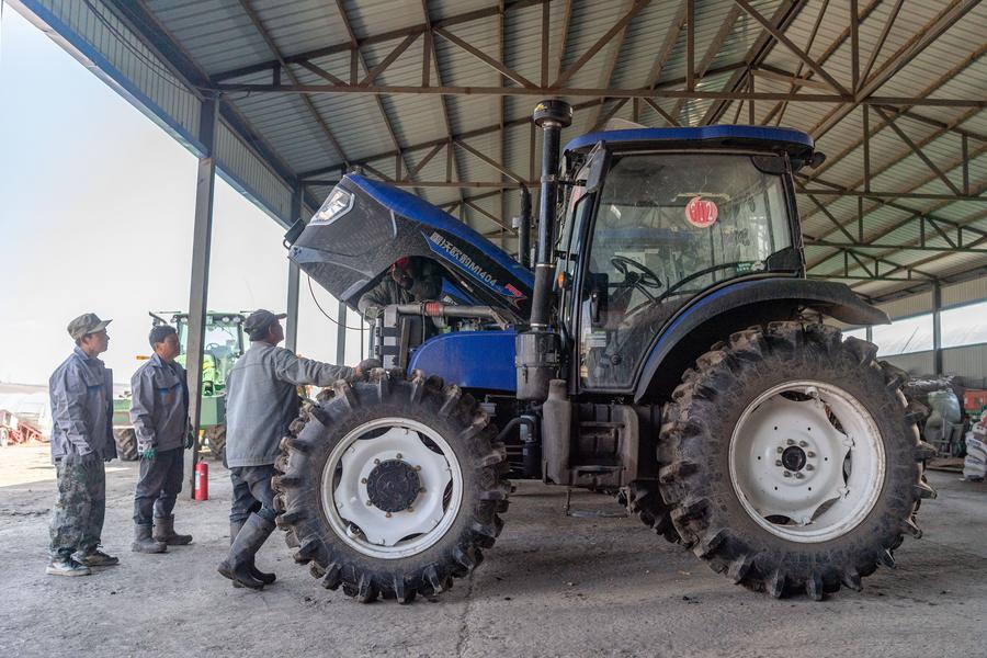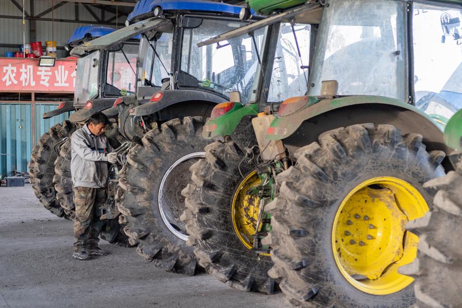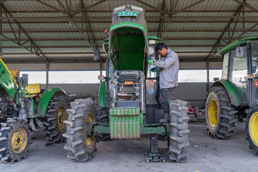 A worker maintains agricultural machinery at a cooperative for rice cultivation in Boli County, northeast China's Heilongjiang Province, April 3, 2024. (Xinhua/Xie Jianfei)