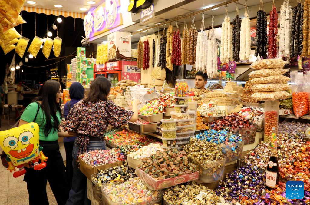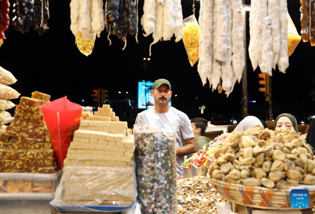 People shop for sweets ahead of Eid al-Fitr in Baghdad, Iraq, on April 3, 2024. (Xinhua/Khalil Dawood)