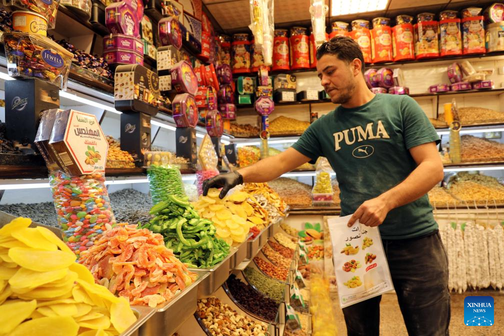 A shop owner arranges dried fruits ahead of Eid al-Fitr in Baghdad, Iraq, on April 3, 2024. (Xinhua/Khalil Dawood)