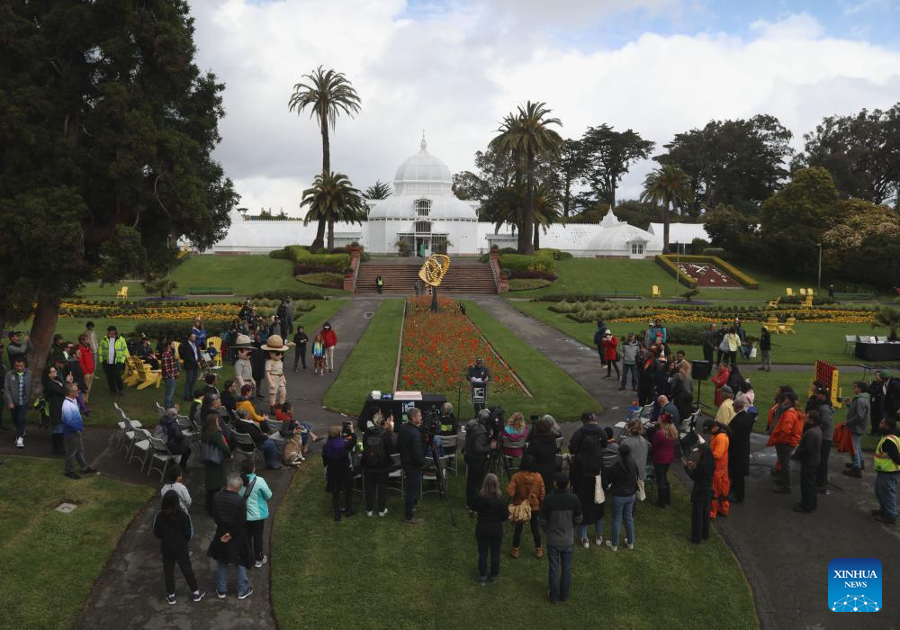 A staff member (2nd R) introduces plants to visitors at a greenhouse of Golden Gate Park in San Francisco, California, the United States, April 4, 2024. Golden Gate Park marked its 154th anniversary on Thursday. (Photo by Liu Yilin/Xinhua)