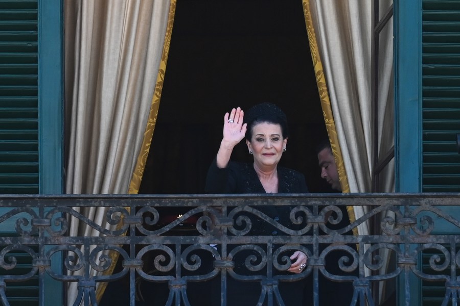 Malta's new president Myriam Spiteri Debono waves to the crowd on the balcony of the Grandmaster's Palace in Valletta, Malta, April 4, 2024. (Photo by Jonathan Borg/Xinhua)