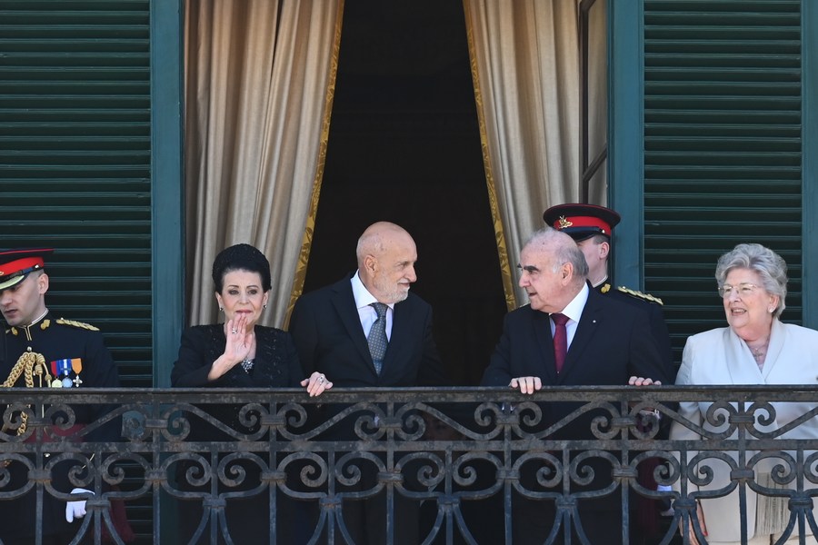 Malta's new president Myriam Spiteri Debono (2nd L) waves to the crowd on the balcony of the Grandmaster's Palace in Valletta, Malta, April 4, 2024. (Photo by Jonathan Borg/Xinhua)