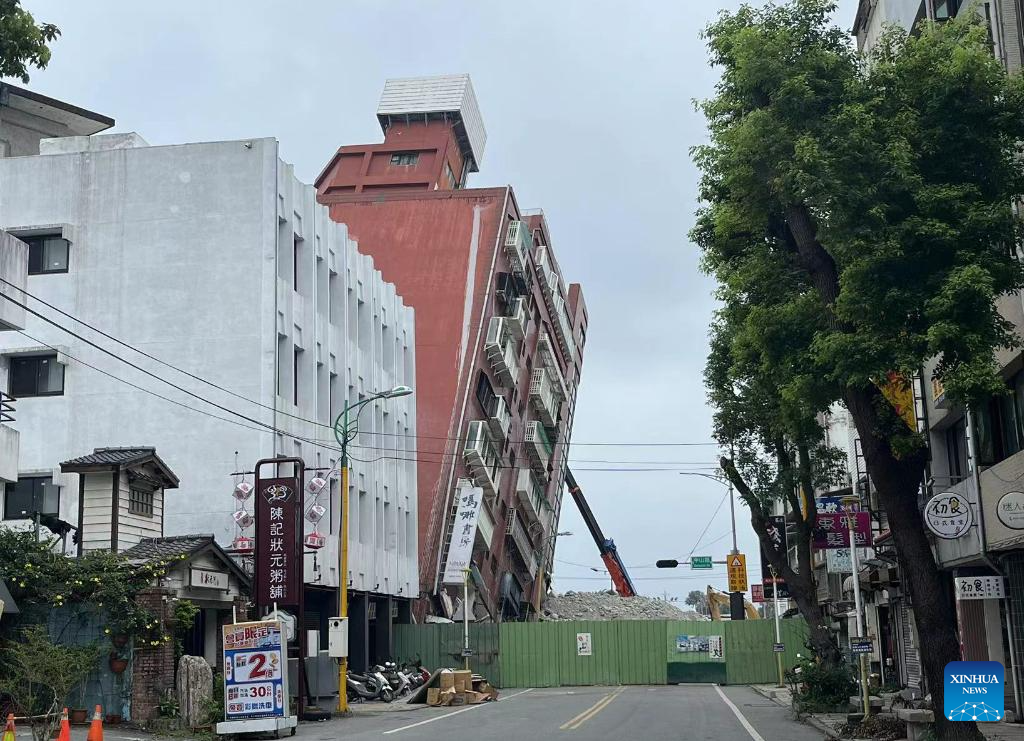 This photo taken on April 5, 2024 shows a tilted building in downtown Hualien after a 7.3-magnitude earthquake in southeast China's Taiwan. The building will be demolished from top to bottom, starting with the front glass wall. A 7.3-magnitude earthquake jolted the sea area near Hualien County in Taiwan at 7:58 a.m. Wednesday (Beijing Time), followed by many aftershocks, according to the China Earthquake Networks Center. (Xinhua/Zhao Bo)