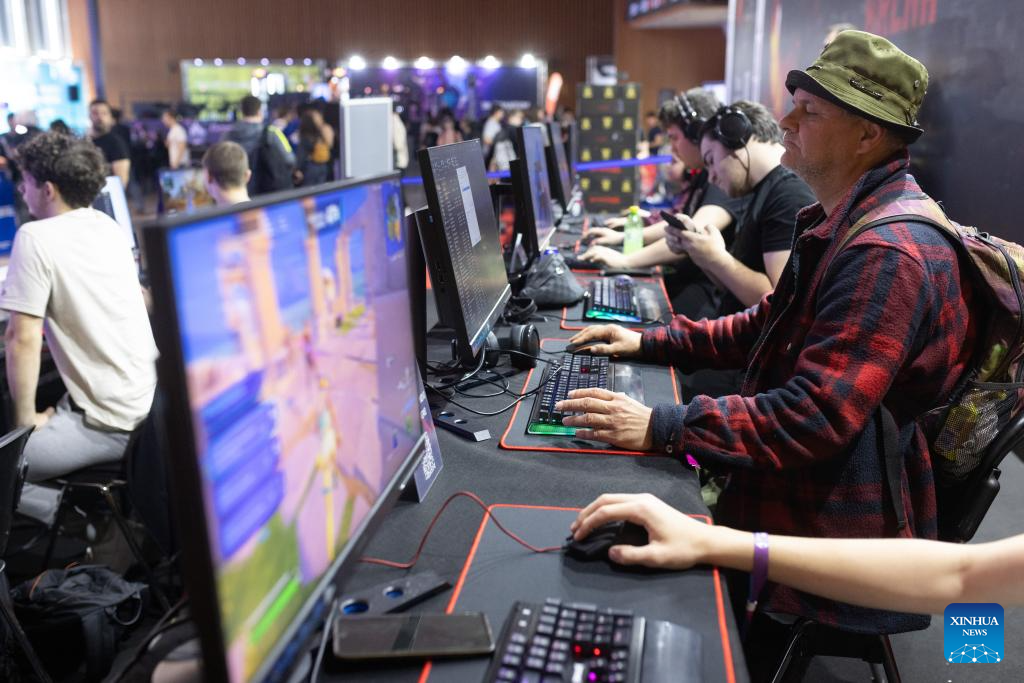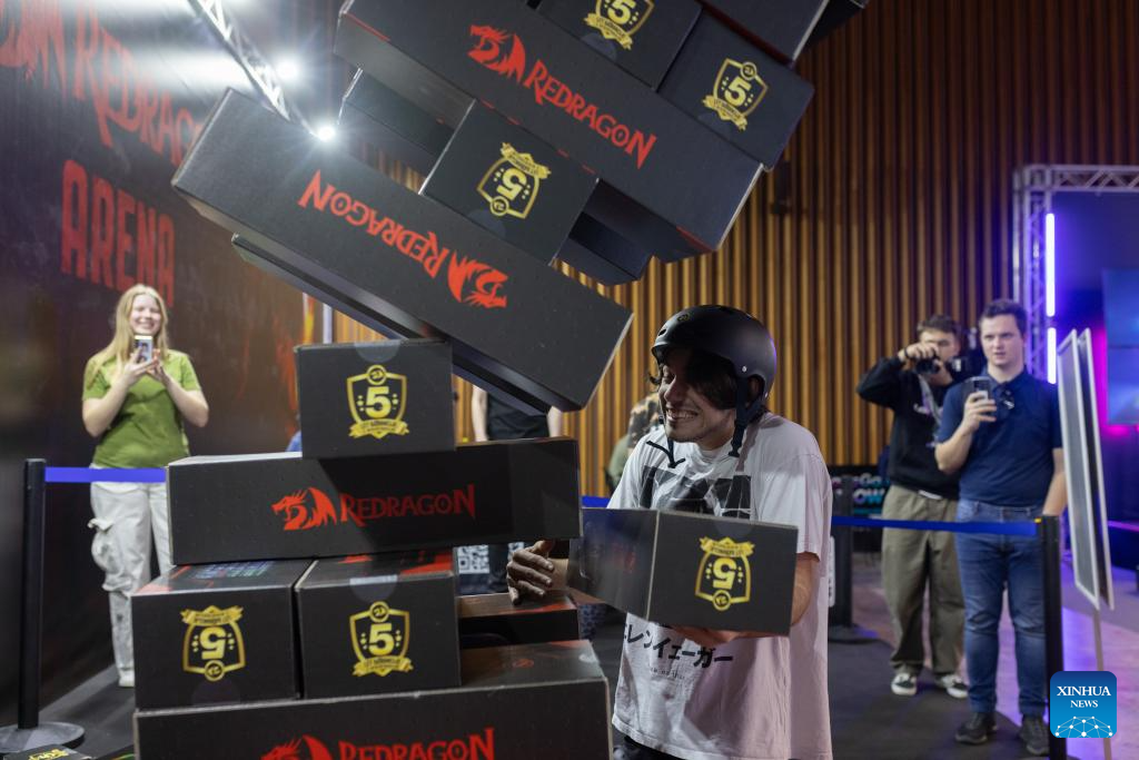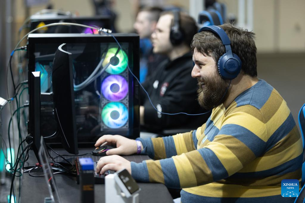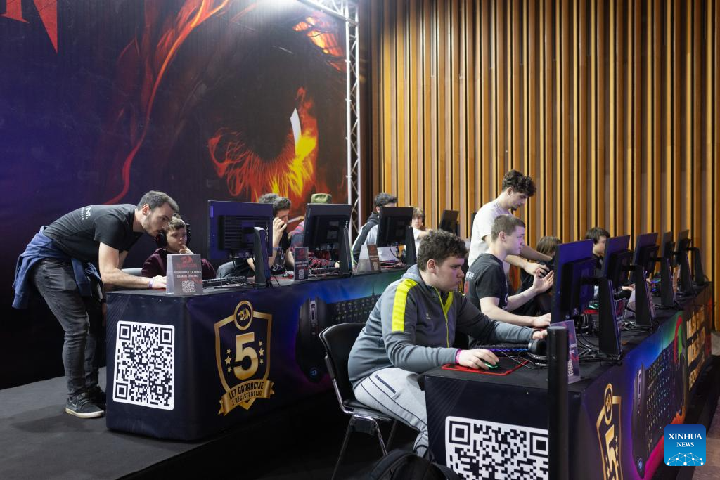 Professional players play games during the Game Gang Show in Ljubljana, Slovenia, on April 5, 2024. The three-day Game Gang Show, a gaming, Esports and entertainment technology festival, started here on Friday. (Photo by Zeljko Stevanic/Xinhua)