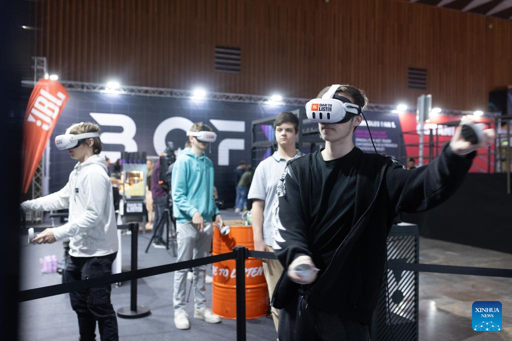 Visitors play a VR game Beat Saber during the Game Gang Show in Ljubljana, Slovenia, on April 5, 2024. The three-day Game Gang Show, a gaming, Esports and entertainment technology festival, started here on Friday. (Photo by Zeljko Stevanic/Xinhua)