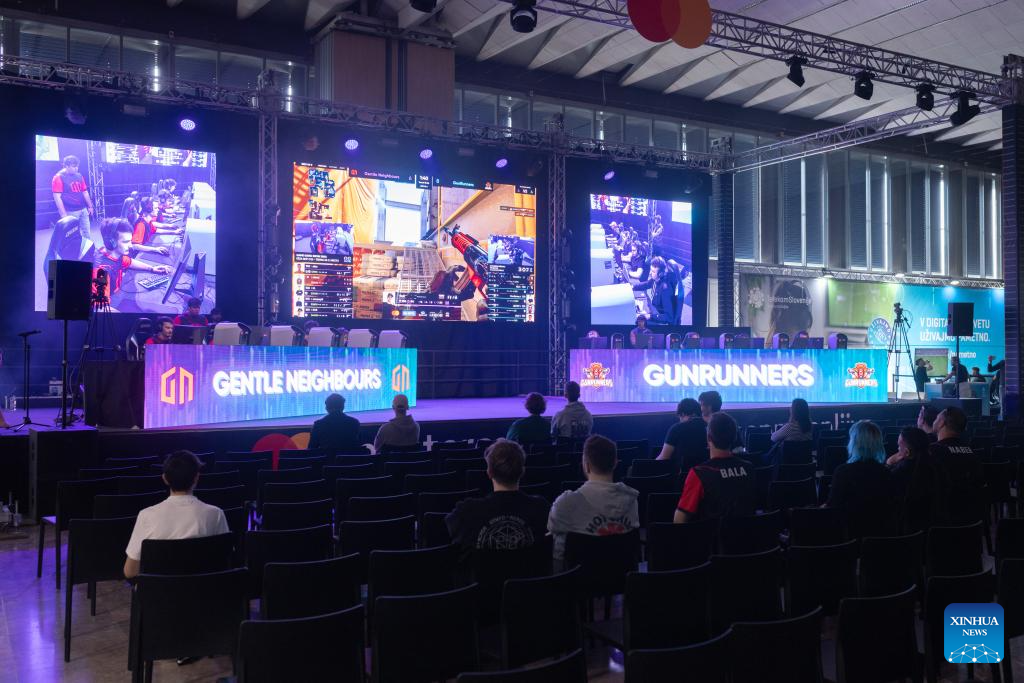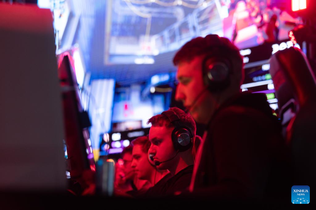 Professional players participate in a competition on the main stage during the Game Gang Show in Ljubljana, Slovenia, on April 5, 2024. The three-day Game Gang Show, a gaming, Esports and entertainment technology festival, started here on Friday. (Photo by Zeljko Stevanic/Xinhua)