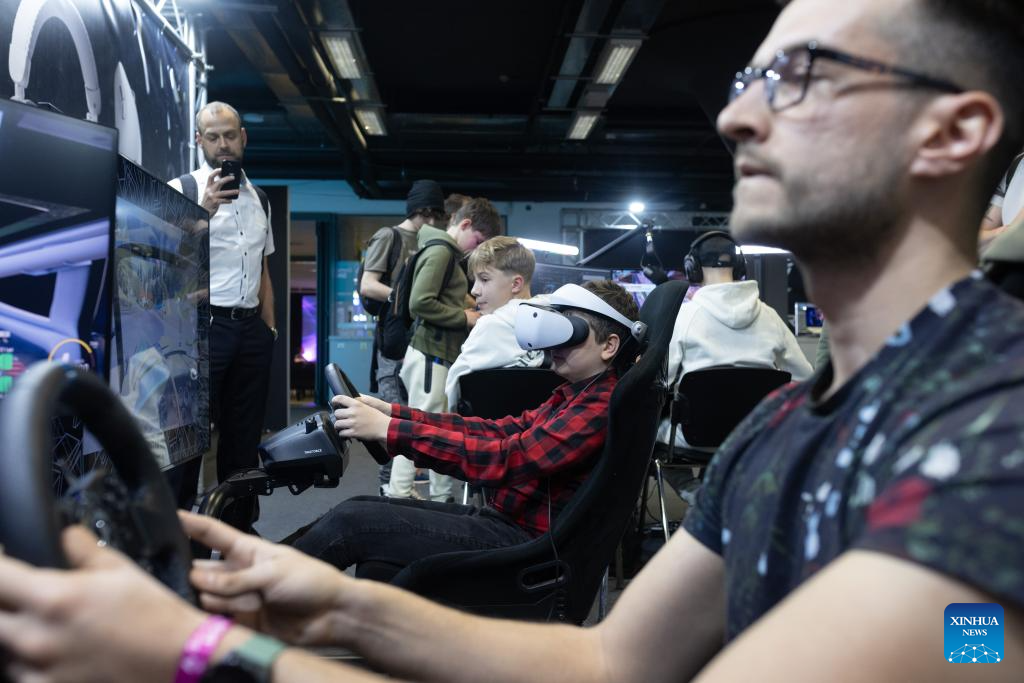Visitors play a racing game during the Game Gang Show in Ljubljana, Slovenia, on April 5, 2024. The three-day Game Gang Show, a gaming, Esports and entertainment technology festival, started here on Friday. (Photo by Zeljko Stevanic/Xinhua)