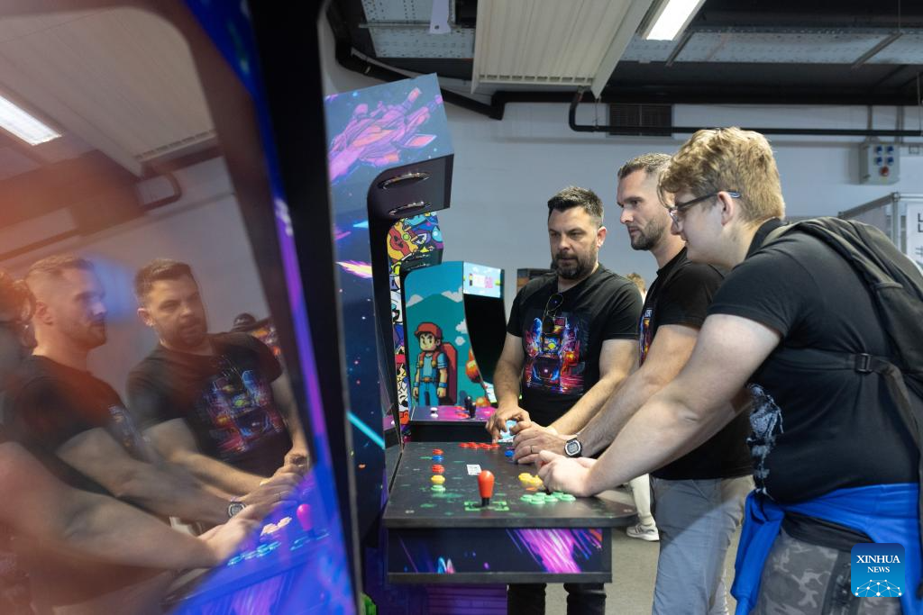 Game lovers play an arcade game during the Game Gang Show in Ljubljana, Slovenia, on April 5, 2024. The three-day Game Gang Show, a gaming, Esports and entertainment technology festival, started here on Friday. (Photo by Zeljko Stevanic/Xinhua)