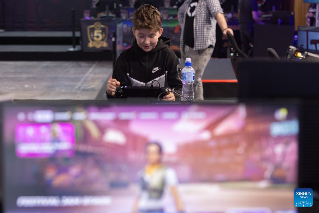 A boy plays a video game during the Game Gang Show in Ljubljana, Slovenia, on April 5, 2024. The three-day Game Gang Show, a gaming, Esports and entertainment technology festival, started here on Friday. (Photo by Zeljko Stevanic/Xinhua)