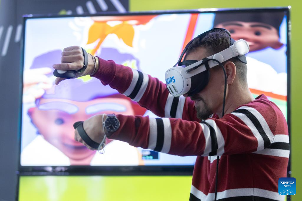 A visitor tries to be a hairdresser in the VR section during the Game Gang Show in Ljubljana, Slovenia, on April 5, 2024. The three-day Game Gang Show, a gaming, Esports and entertainment technology festival, started here on Friday. (Photo by Zeljko Stevanic/Xinhua)