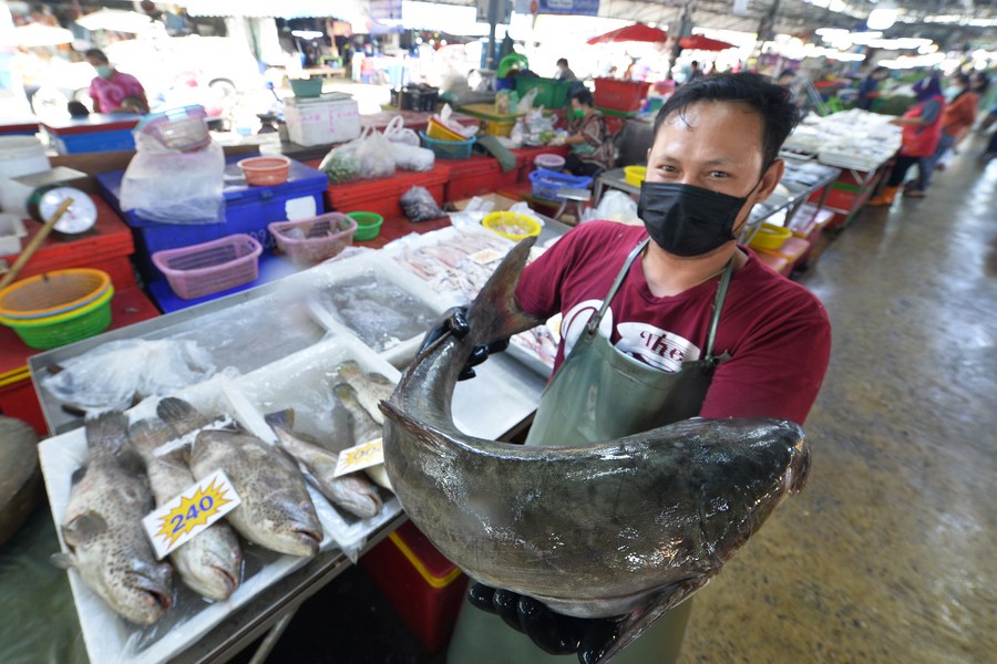 A vendor displays a fish at a food market in Bangkok, Thailand, March 30, 2022. (Xinhua/Rachen Sageamsak)