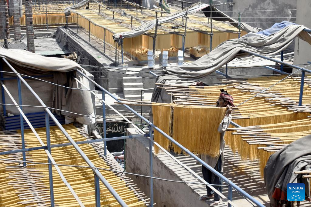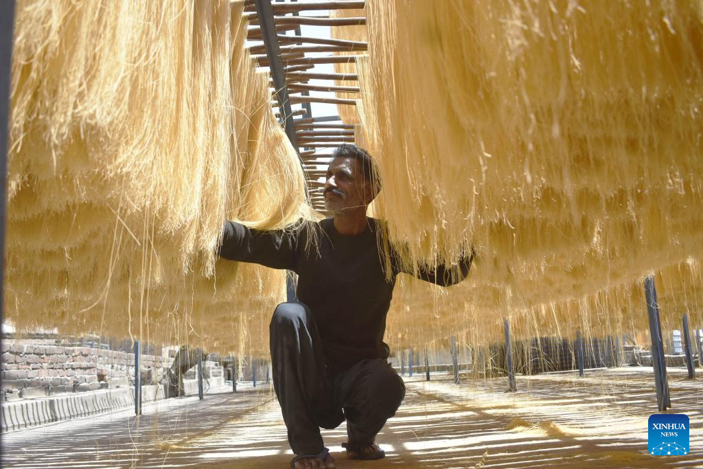 A worker hangs vermicelli noodles at a factory in Lahore, Pakistan on April 6, 2024. (Photo by Sajjad/Xinhua)