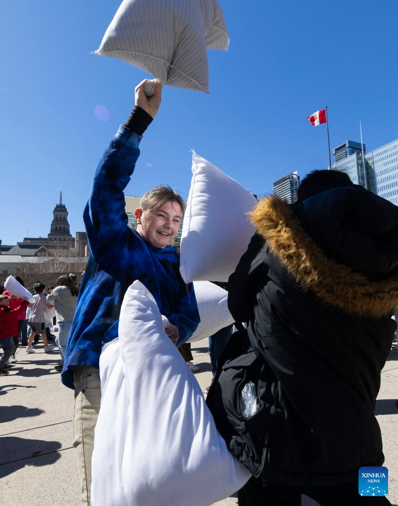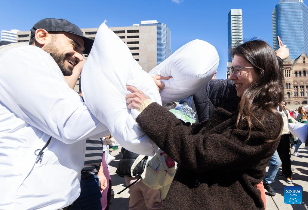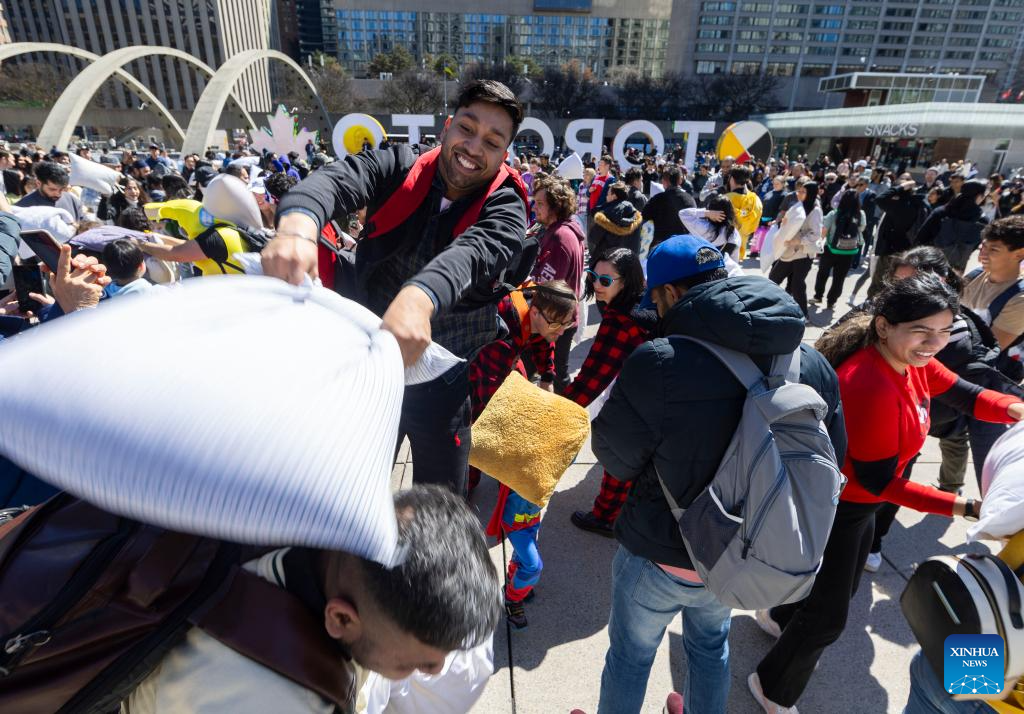 People participate in a pillow fight event in Toronto, Canada, April 6, 2024. (Photo by Zou Zheng/Xinhua)