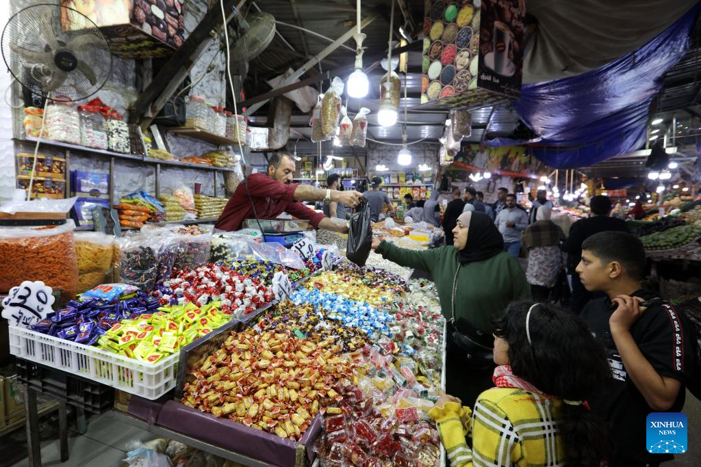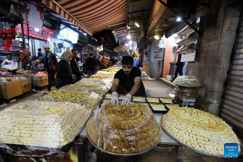People buy sweets ahead of Eid al-Fitr, which marks the end of the month of Ramadan, at a market in Amman, Jordan, on April 6, 2024. (Photo by Mohammad Abu Ghosh/Xinhua)