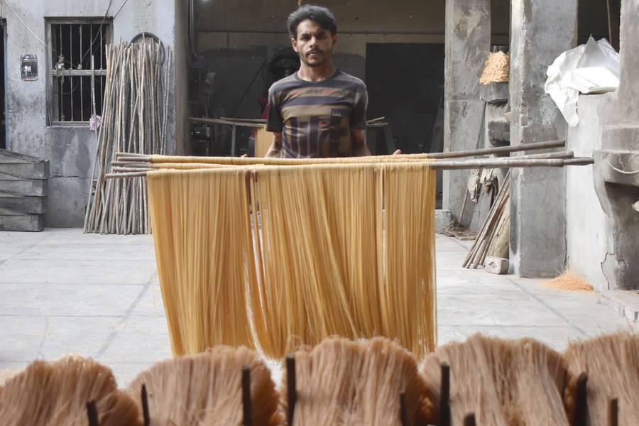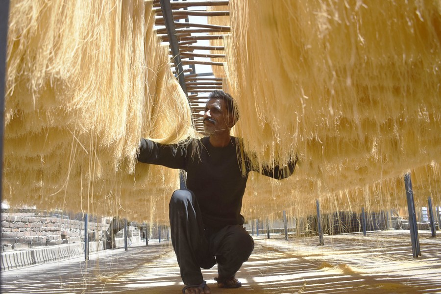 A worker hangs vermicelli noodles at a factory in Lahore, Pakistan on April 6, 2024. (Photo by Sajjad/Xinhua)