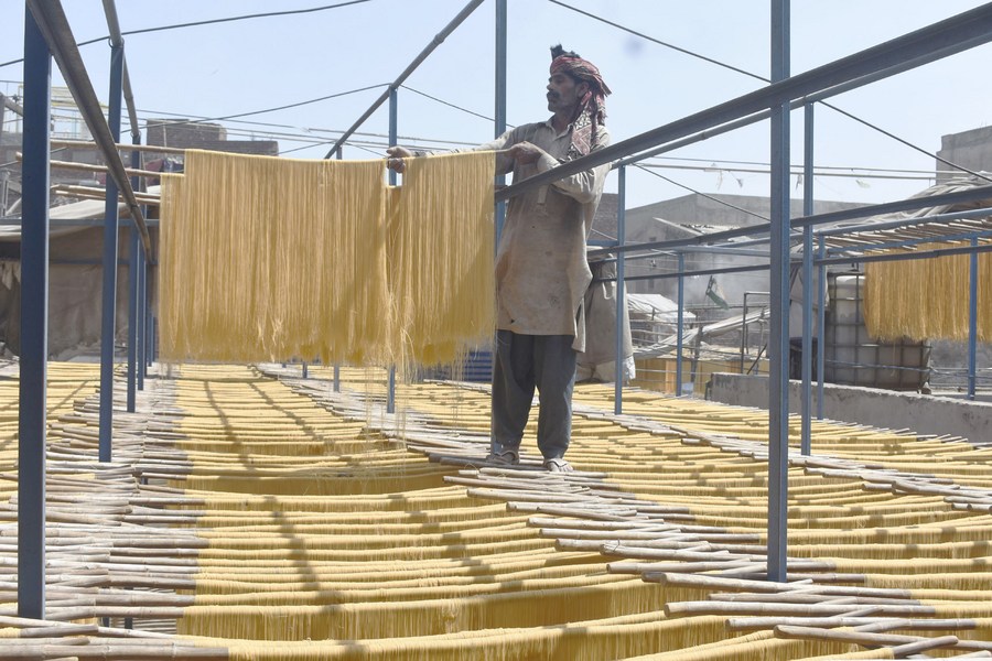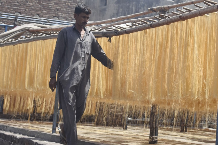 A worker arranges vermicelli noodles at a factory in Lahore, Pakistan on April 6, 2024. (Photo by Sajjad/Xinhua)