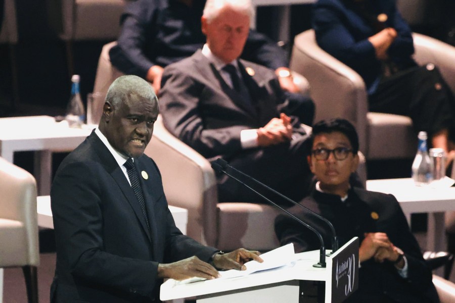 Chairperson of the African Union (AU) Commission Moussa Faki Mahamat makes a speech during the commemoration of the 30th anniversary of the 1994 genocide against the Tutsi in Kigali, the capital of Rwanda, on April 7, 2024. (Photo by Cyril Ndegeya/Xinhua)