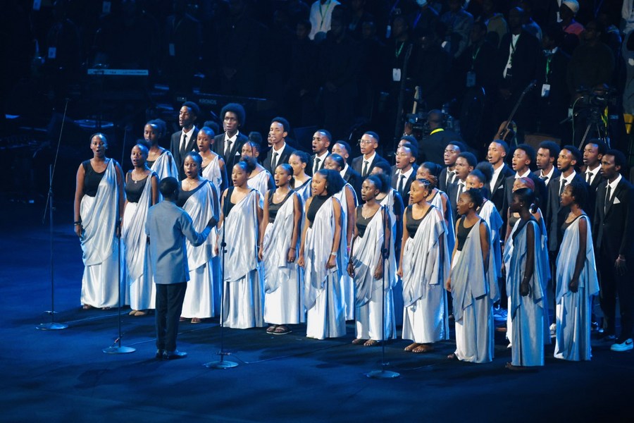 Students perform during the commemoration of the 30th anniversary of the 1994 genocide against the Tutsi in Kigali, the capital of Rwanda, on April 7, 2024. (Photo by Cyril Ndegeya/Xinhua)