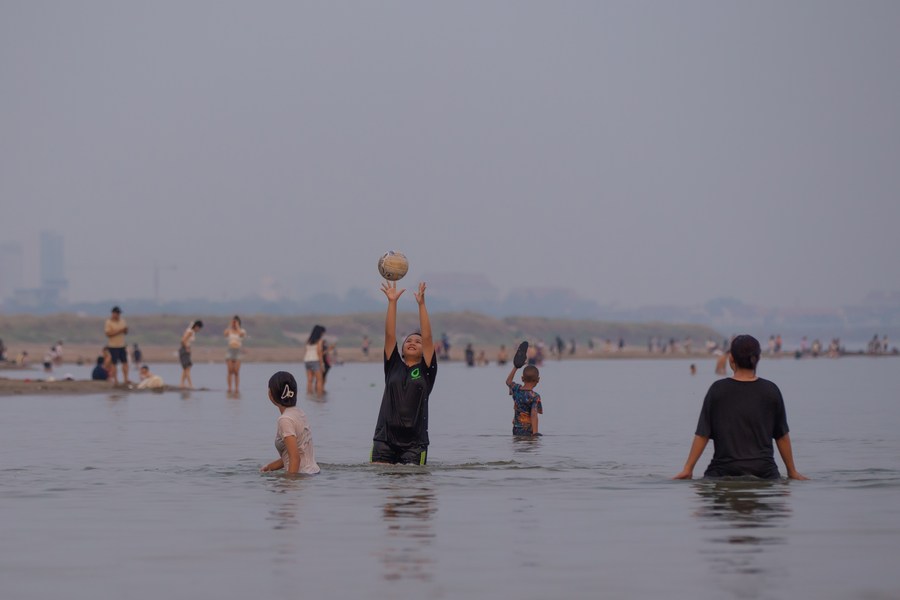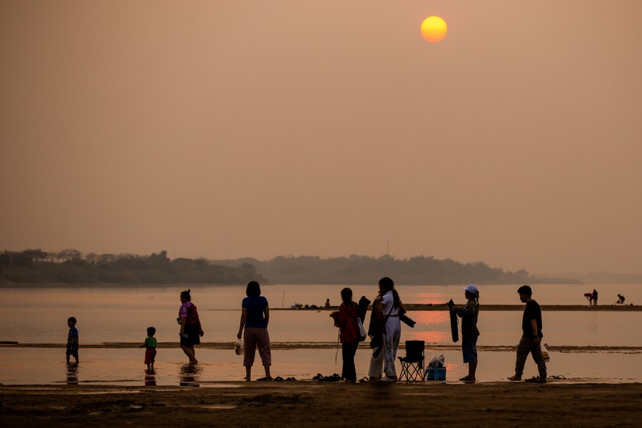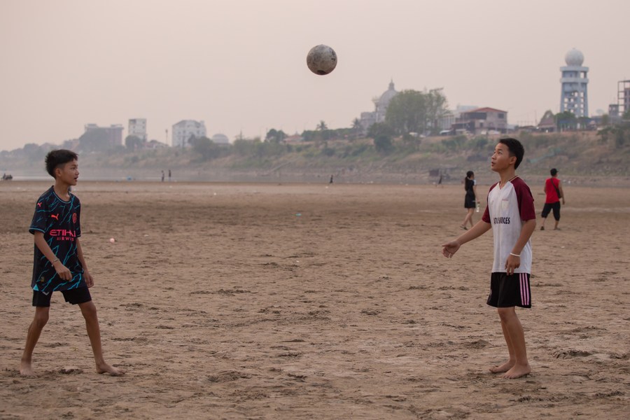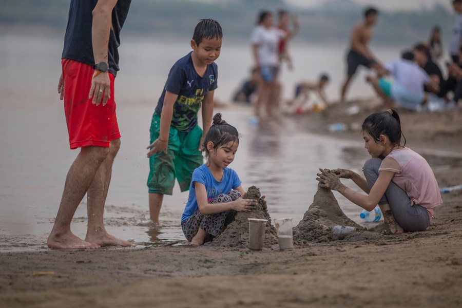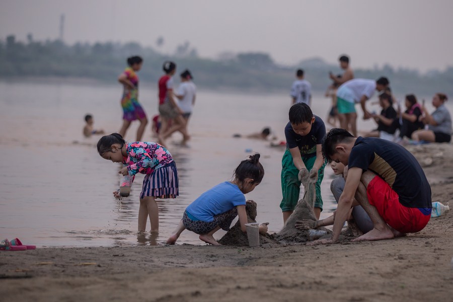 People play by the Mekong River in Vientiane, capital of Laos, April 6, 2024. (Photo by Kaikeo Saiyasane/Xinhua)