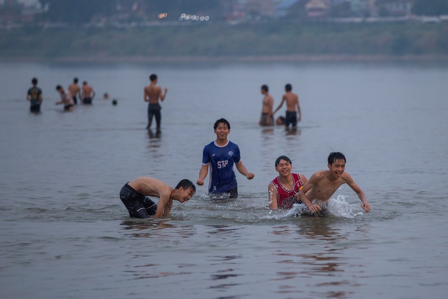 People swim in the Mekong River in Vientiane, capital of Laos, April 6, 2024. (Photo by Kaikeo Saiyasane/Xinhua)