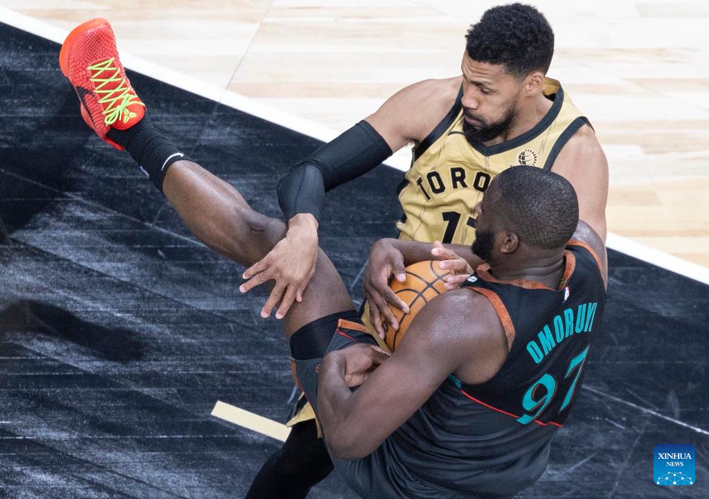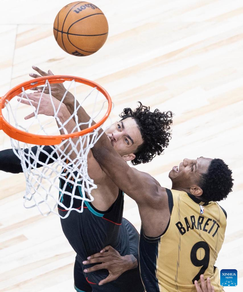 Gary Trent Jr. (Back) of Toronto Raptors fights for a rebound with Deni Avdija of Washington Wizards during the 2023-2024 NBA regular season game between Toronto Raptors and Washington Wizards in Toronto, Canada, April 7, 2024. (Photo by Zou Zheng/Xinhua)