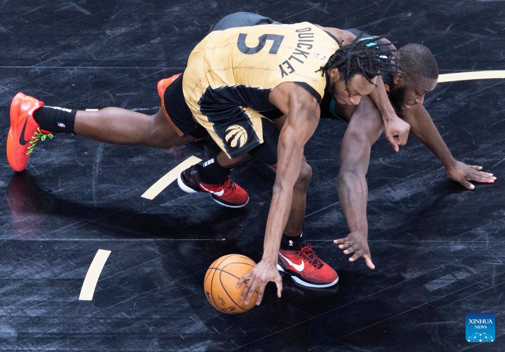 Immanuel Quickley (L) of Toronto Raptors vies with Eugene Omoruyi of Washington Wizards during the 2023-2024 NBA regular season game between Toronto Raptors and Washington Wizards in Toronto, Canada, April 7, 2024. (Photo by Zou Zheng/Xinhua)