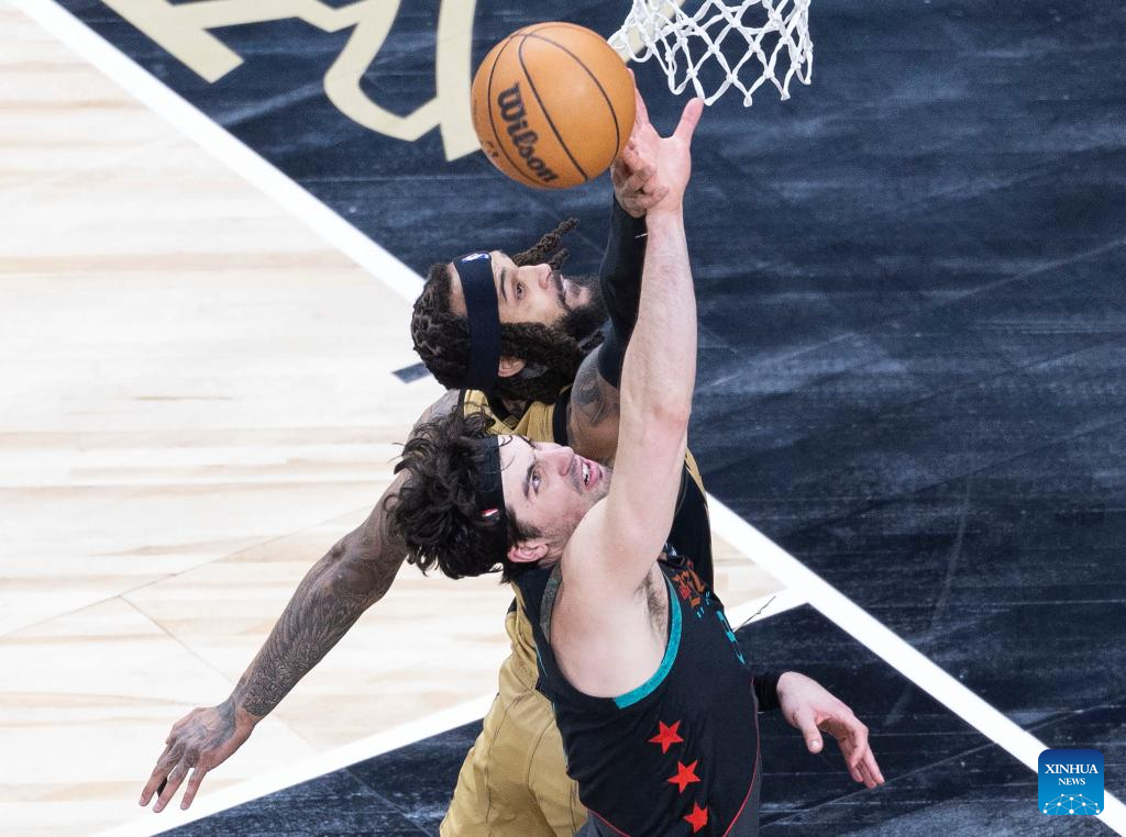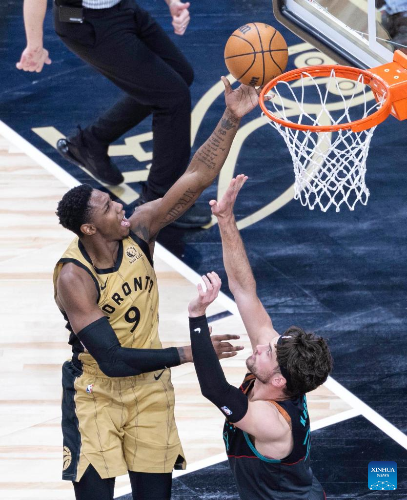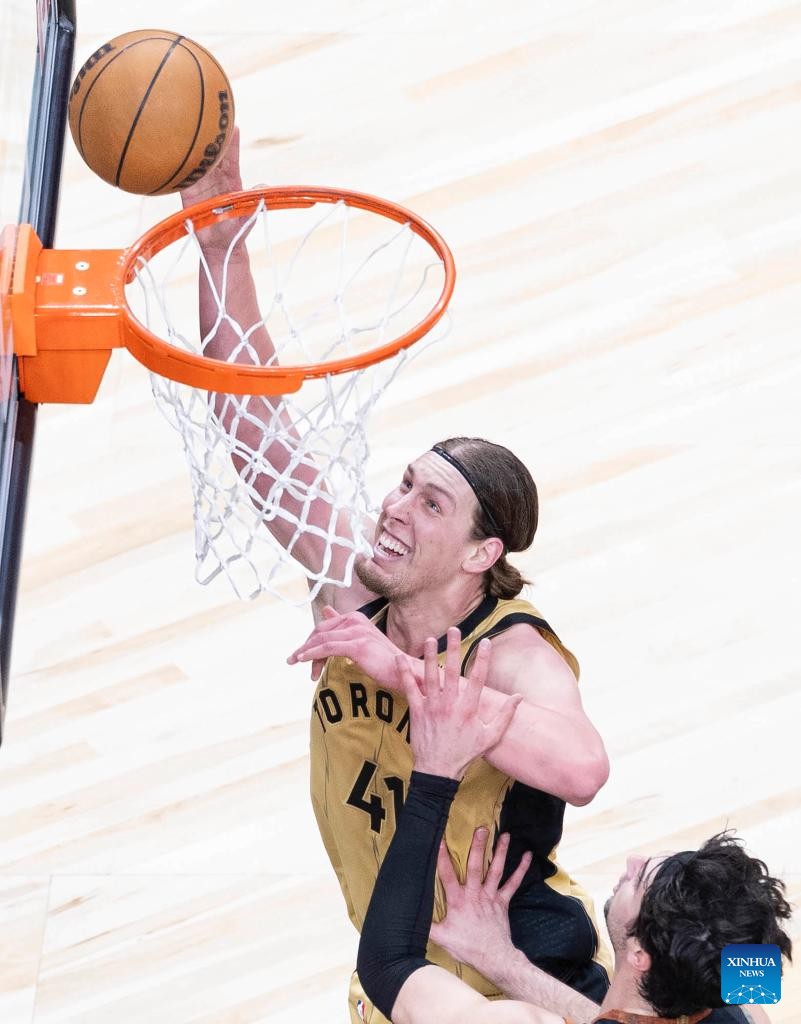 Kelly Olynyk (Top) of Toronto Raptors makes a layup during the 2023-2024 NBA regular season game between Toronto Raptors and Washington Wizards in Toronto, Canada, April 7, 2024. (Photo by Zou Zheng/Xinhua)